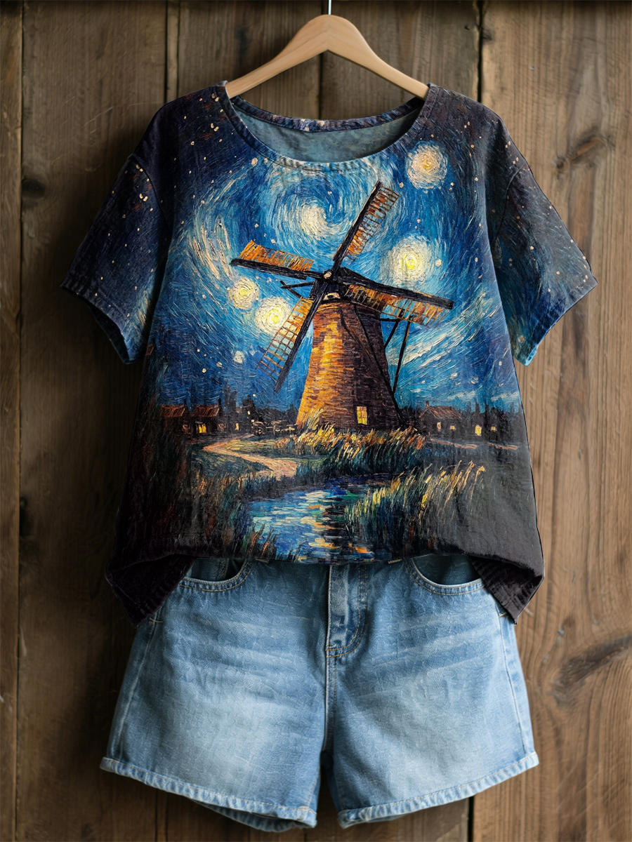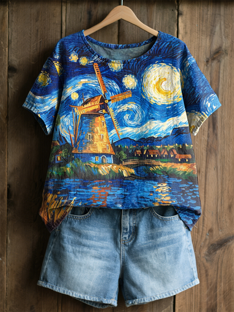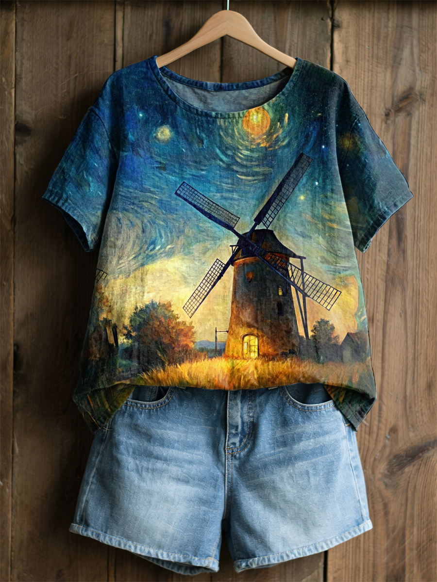 Women's Retro Oil Painting Starry Sky Windmill Print Casual Short-Sleeve Shirt
