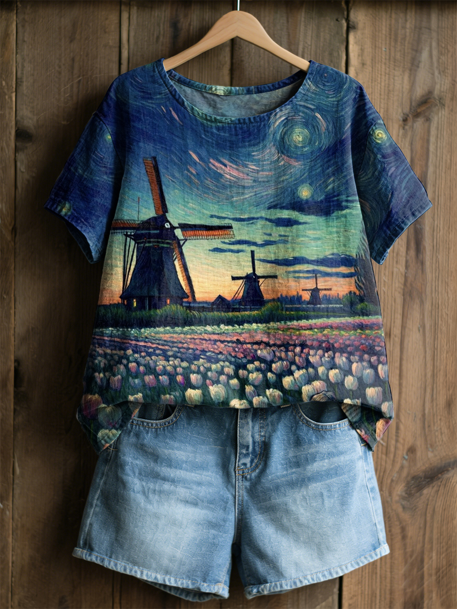 Women's Retro Oil Painting Starry Sky Windmill Tulip Print Casual Short-Sleeve Shirt