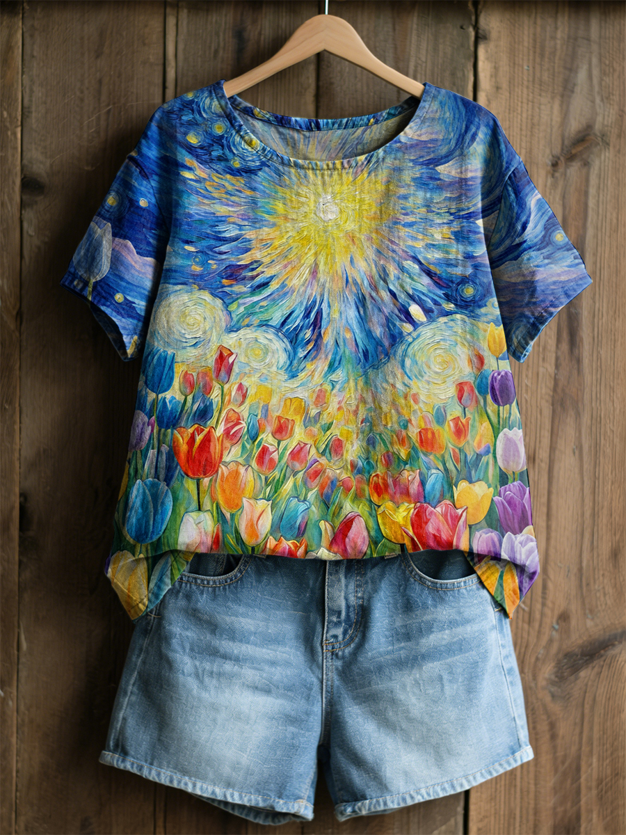 Women's Retro Oil Painting Starry Sky Tulip Print Casual Short-Sleeve Shirt