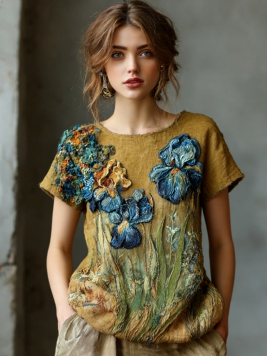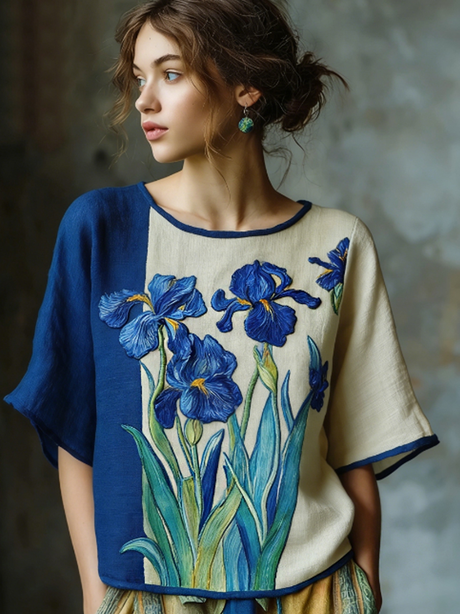 Women's Oil Painting Inspired Irises Embroidered Flowy Linen Casual Shirt