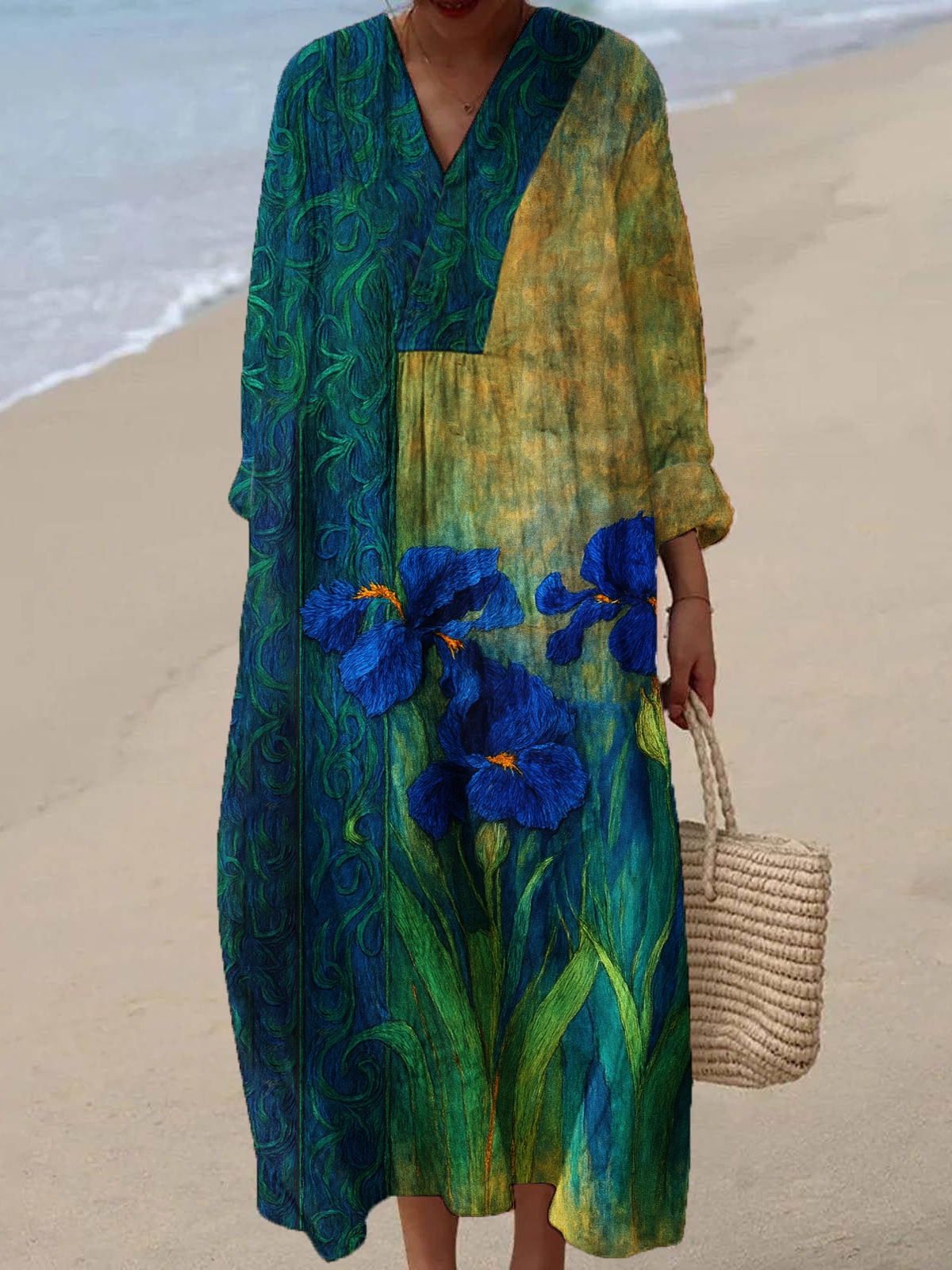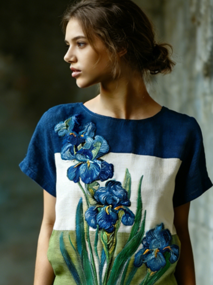 Women's Oil Painting Inspired Irises Embroidered Flowy Linen Casual Dress