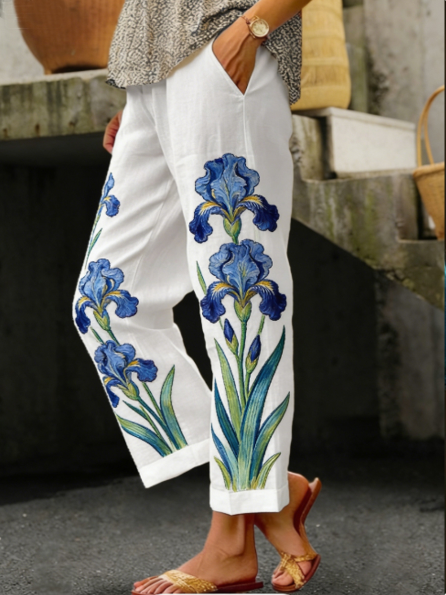 Women's Oil Painting Inspired Iris Embroidery Flowing Linen Casual Pants