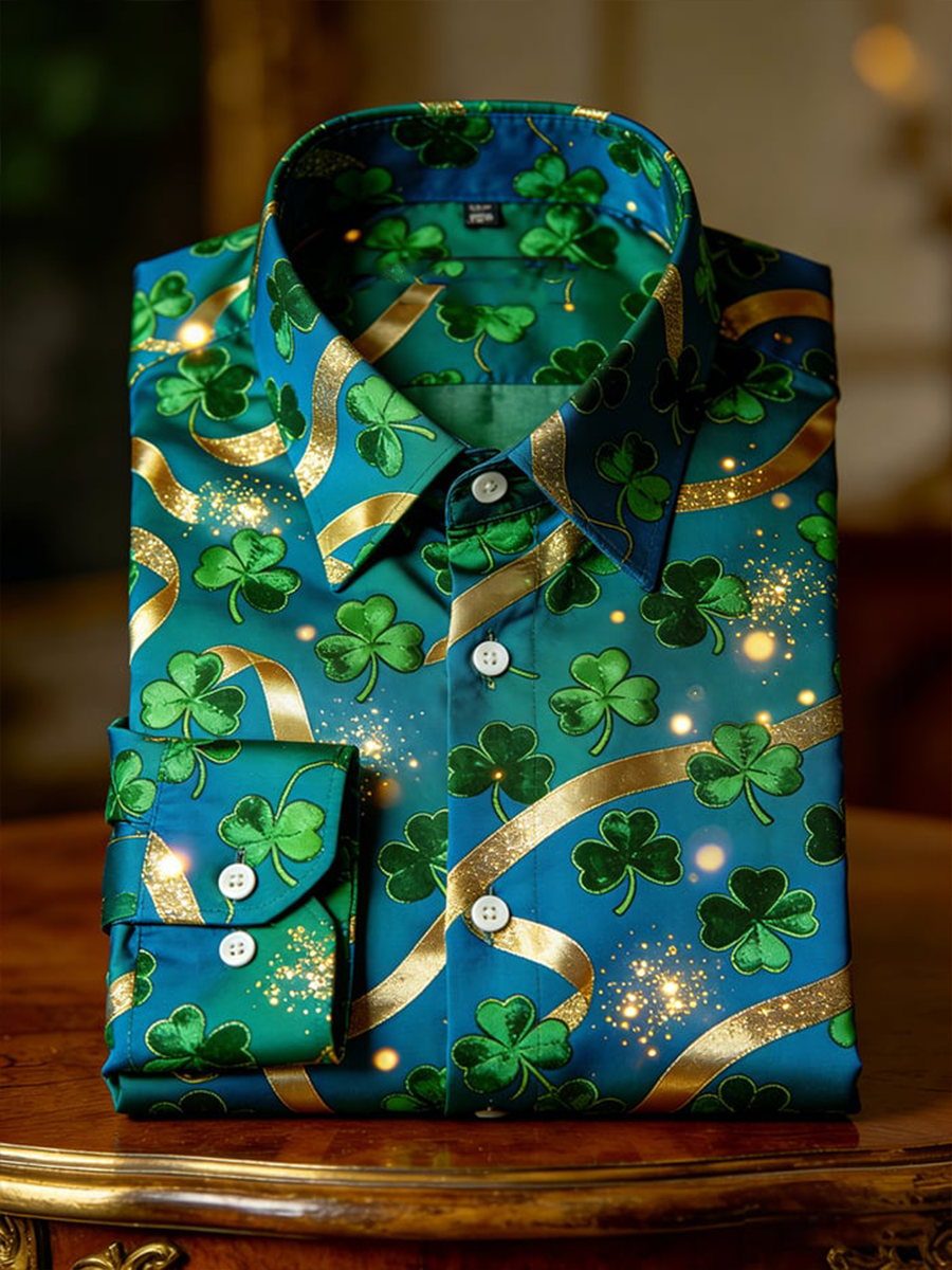 Men's Luxury St. Patrick's Day Shamrock Print Long-Sleeve Shirt
