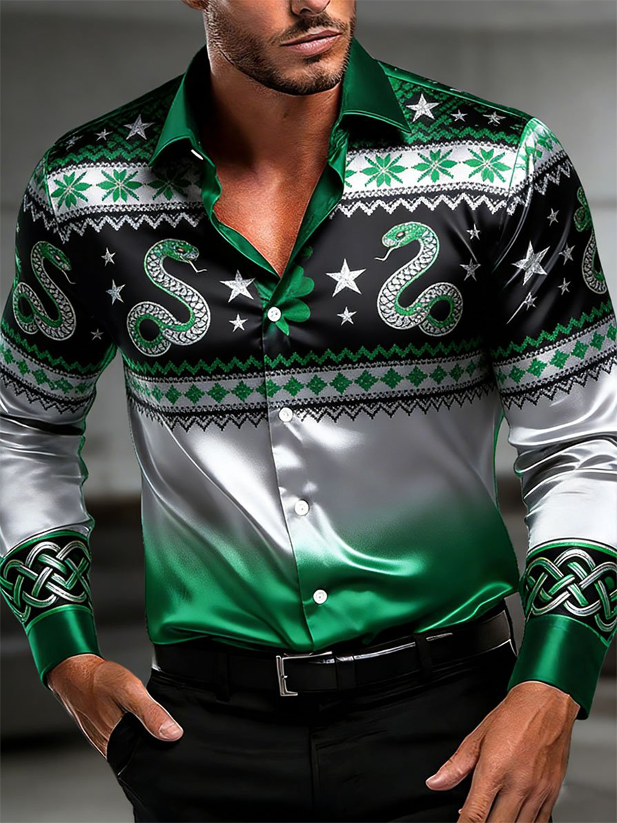 Women's St. Patrick's Day Shamrock Art Printed Satin Lapel Shirt
