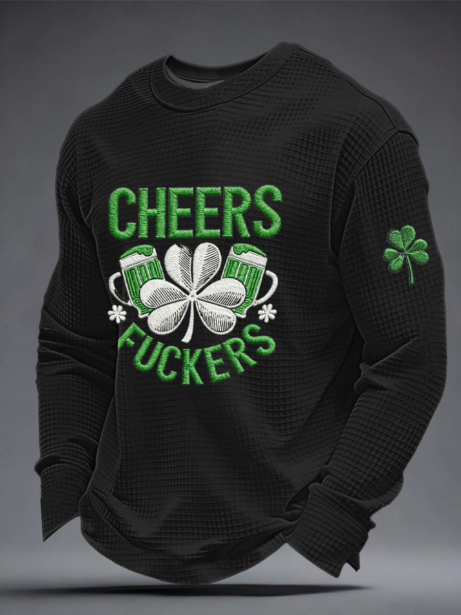Men's Funny St Patrick's Day Cheers F*ckers Green Beer Shamrock Print Waffle Long Sleeve T-Shirt