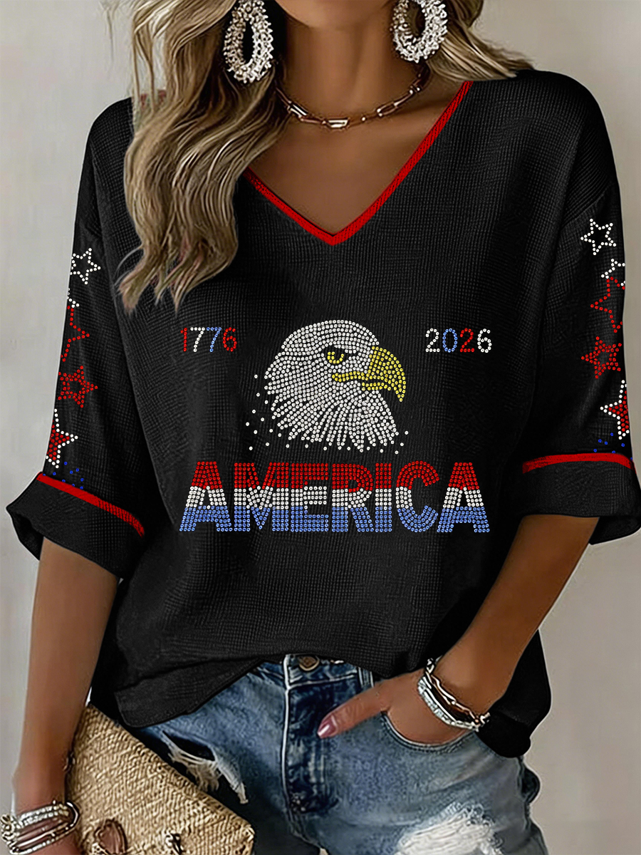 Women's USA 1776-2026 Rhinestone Pattern V-Neck Waffle Top
