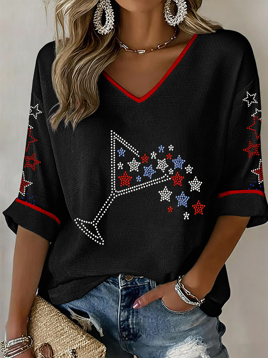 Women's Martini Stars Bling Pattern V-Neck Waffle Top