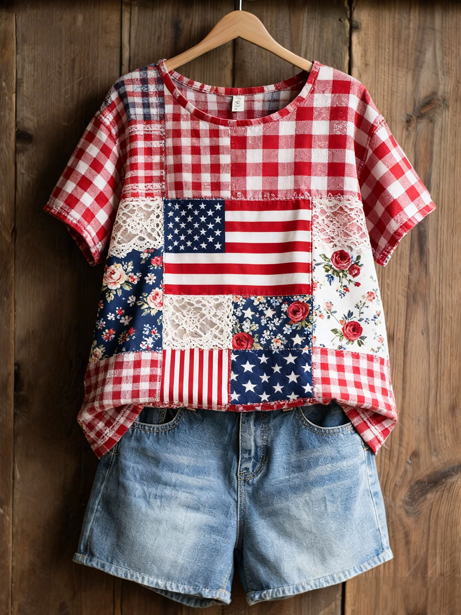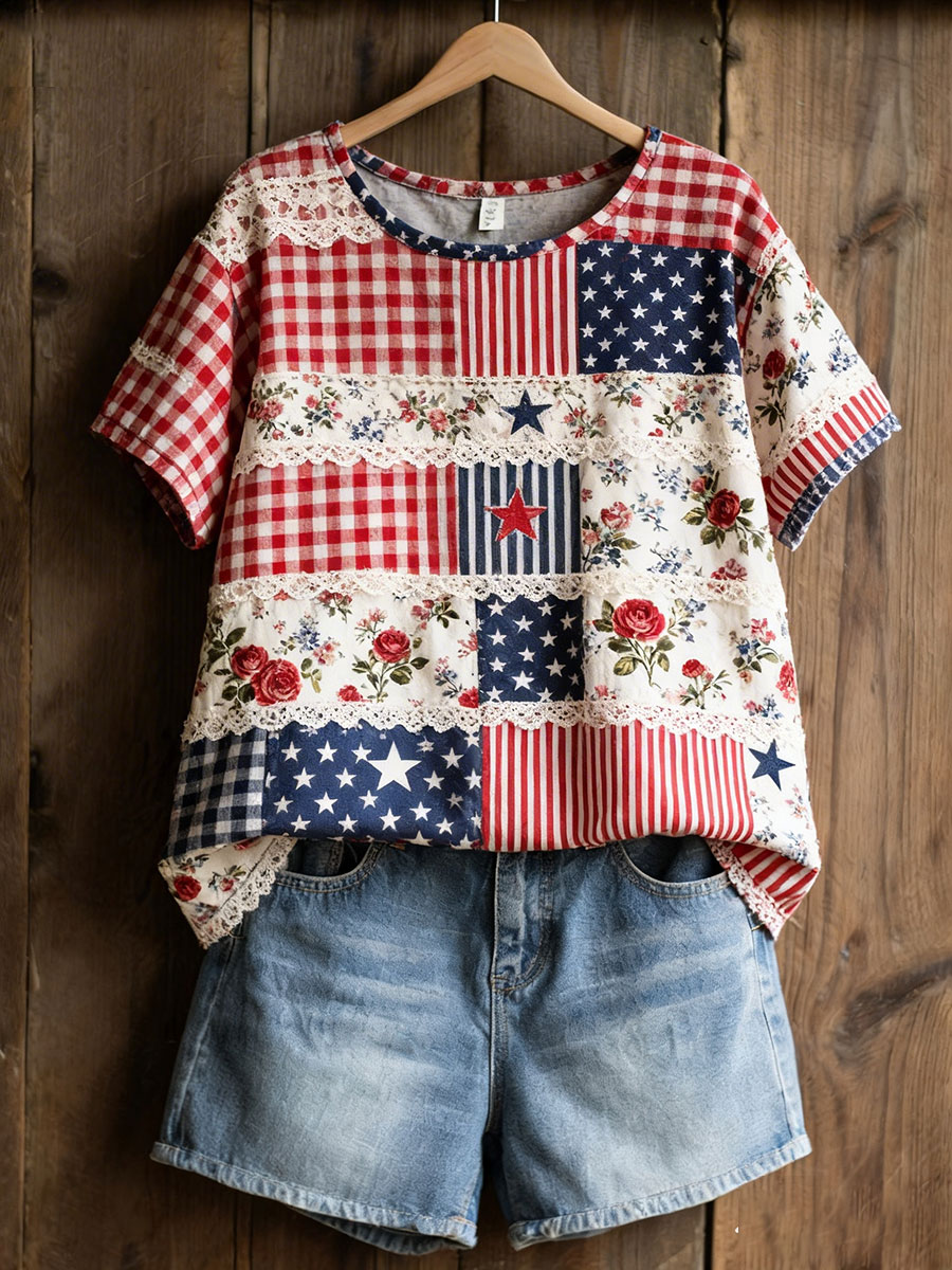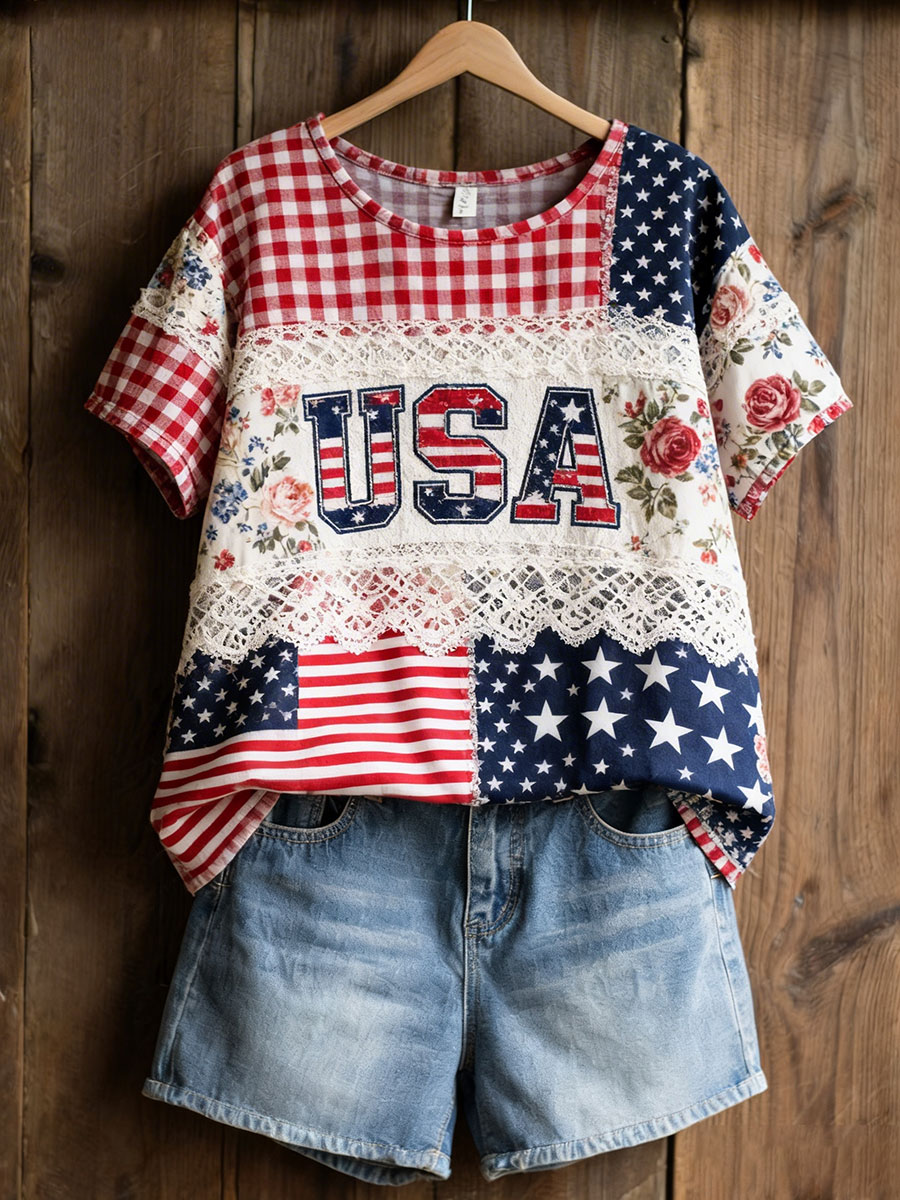 Women's American Floral Patchwork Print Casual T-Shirt