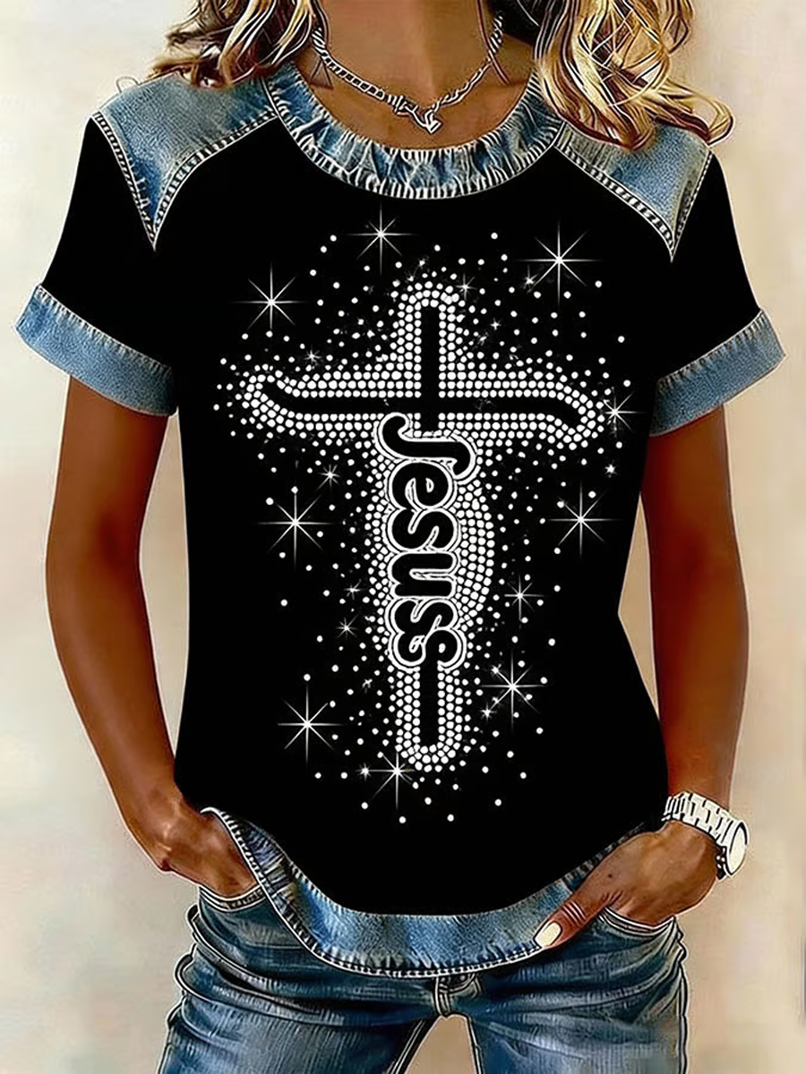 Women's Faith Art Printed Denim Patchwork Top