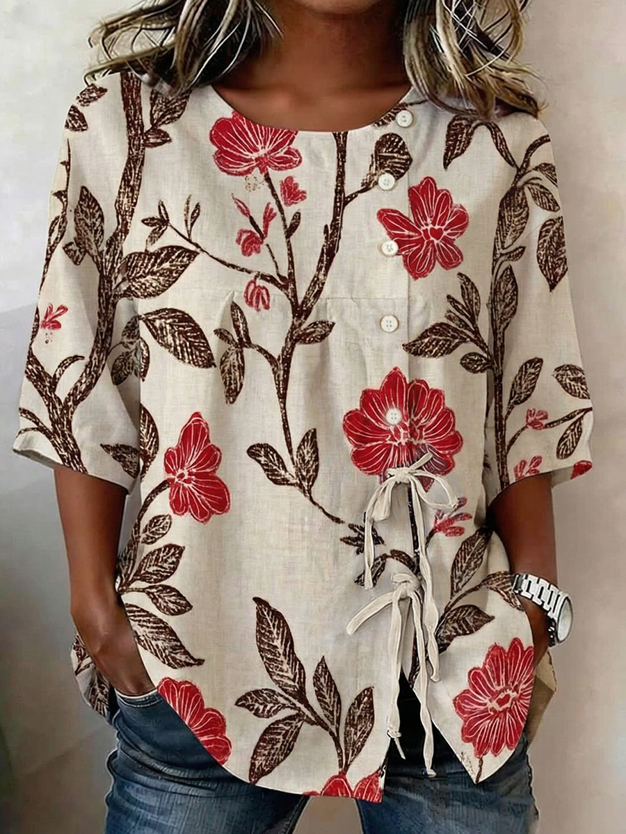 Women's Plant And Flower Buttoned And Laced Linen Blend Shirt