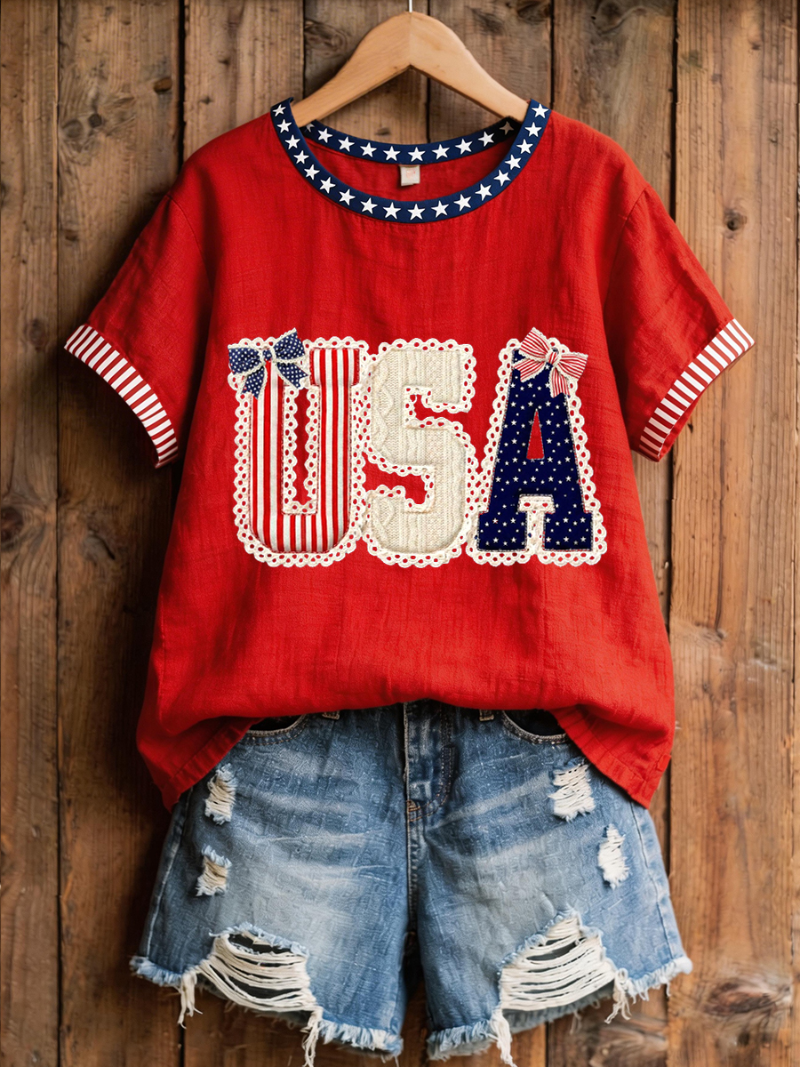 Women's USA Patchwork Pattern Linen Blend Shirt